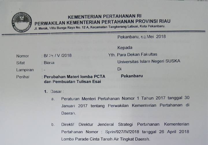 Math.uin-suska.ac.id – Perubahan Materi Lomba Parade Cinta Tanah Air (PCTA) dan Pembuatan Tulisan Esai Kementerian Pertahanan RI Perwakilan Kementerian Pertahanan Provinsi Riau.Read More