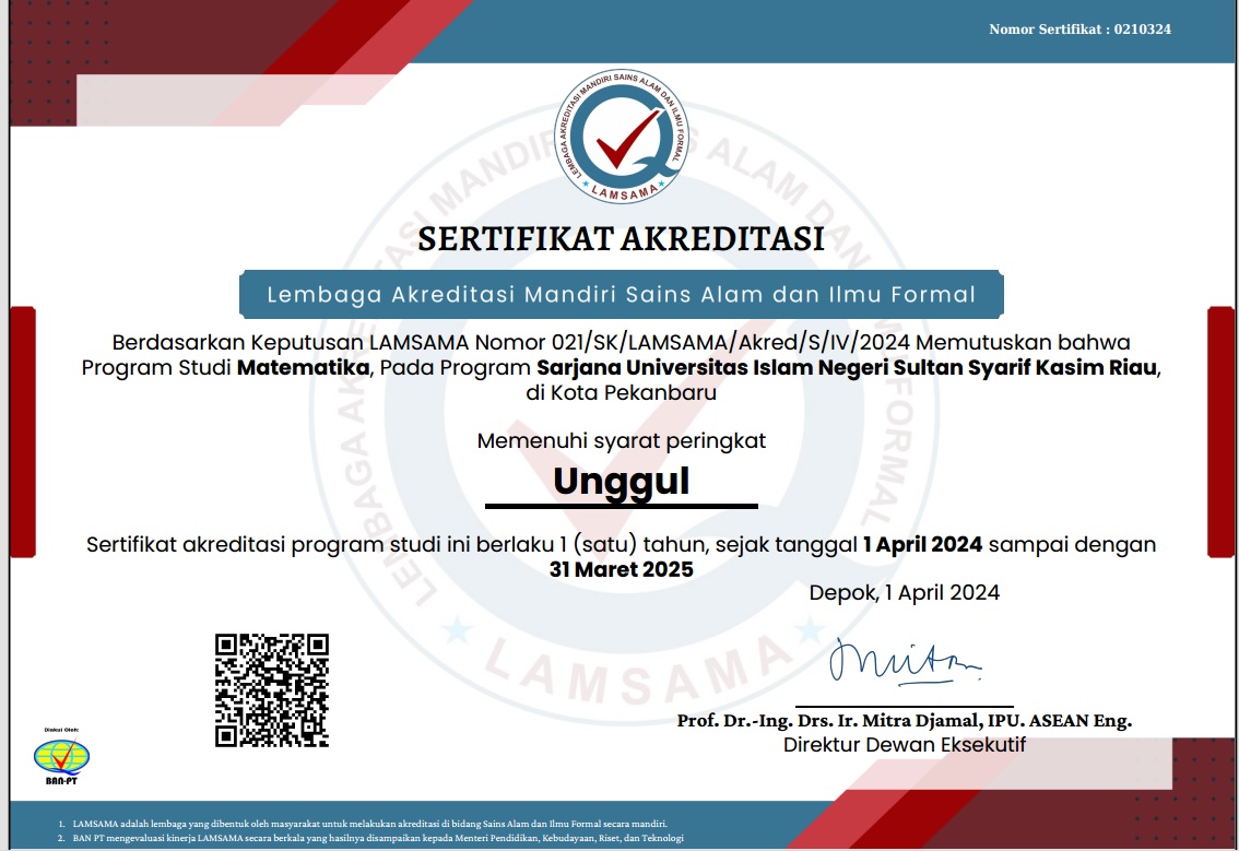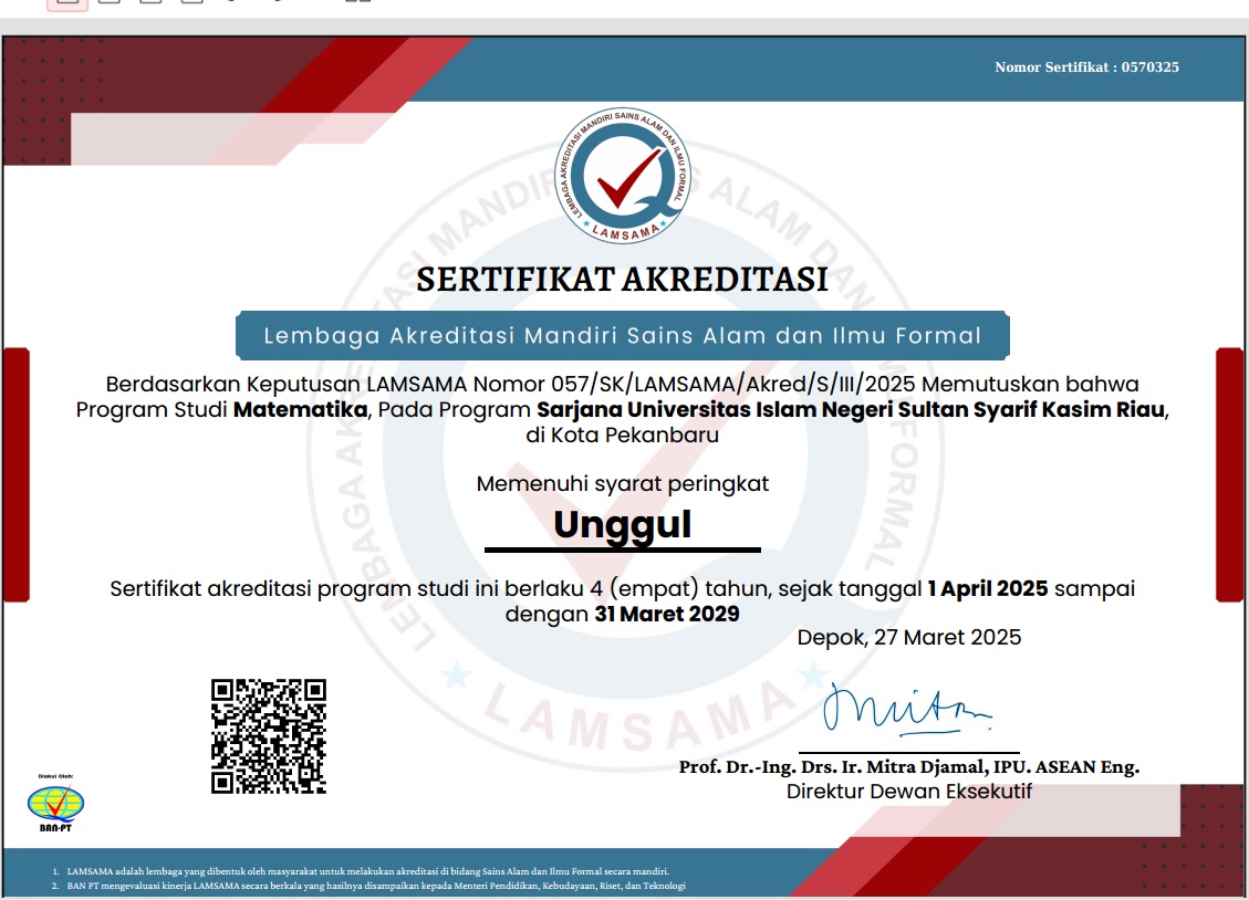 Sertifikat Akreditasi Program Studi Matematika Fakultas Sains dan Teknologi UIN SUSKA RIAU
